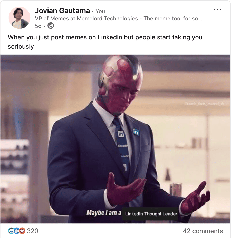 Here’s quick example. I posted this meme about LinkedIn thought leader last week. It got 320 likes so far.