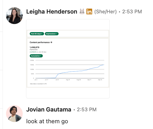 My friend and an up-and-coming meme queen Leigha Henderson had 1M+ in a month impression on LinkedIn just by posting memes consistently.