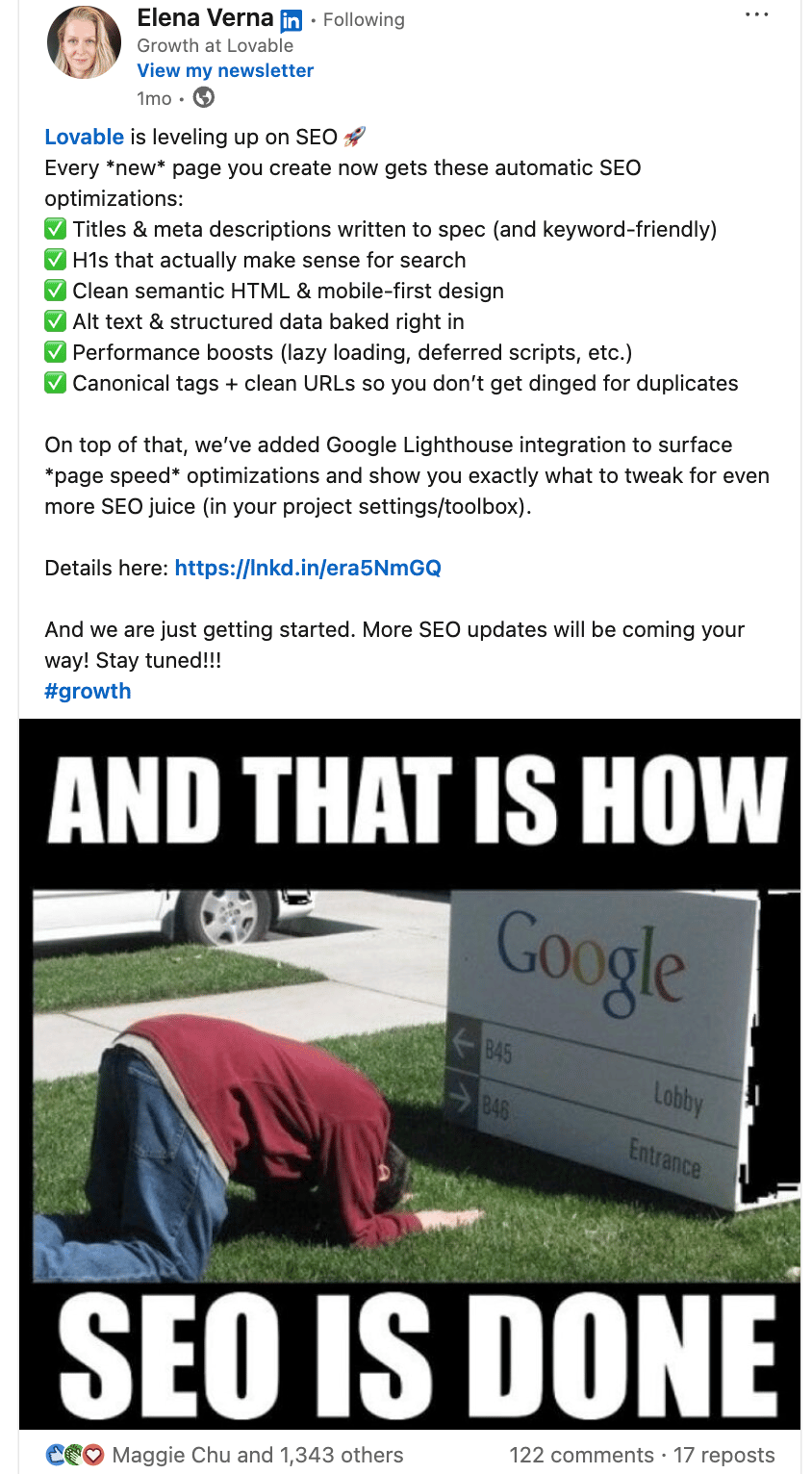 Lovable’s Head of Growth Elena Verna has 160K+ followers and one of LinkedIn’s Top Voice.