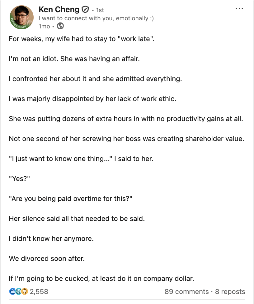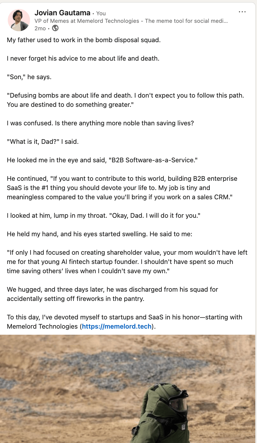 That’s why the r/LinkedInLunatics subreddit is popular. Hell, one of our popular Memelord.com account on X are the LinkedIn Lunatics.