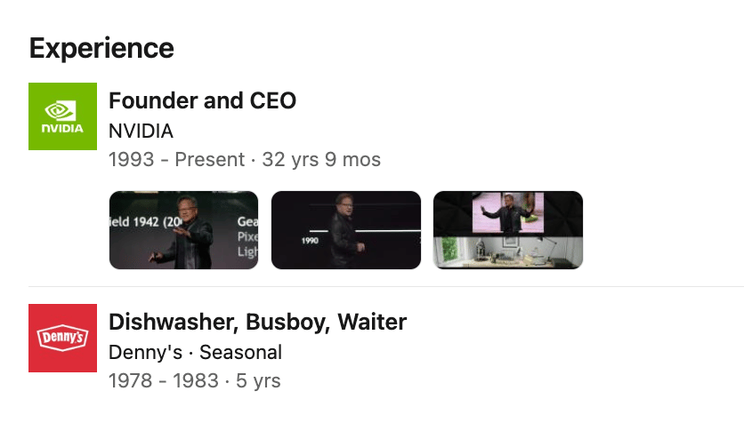 You put your real face out there (mostly), you put your resume and skills, and experience from being a Denny’s waiter to trillion dollar company CEO.